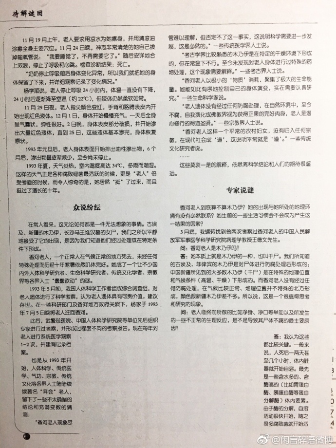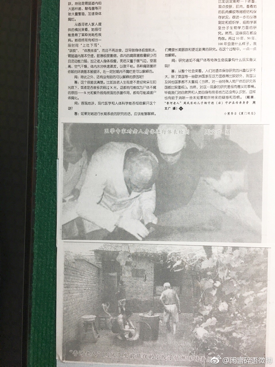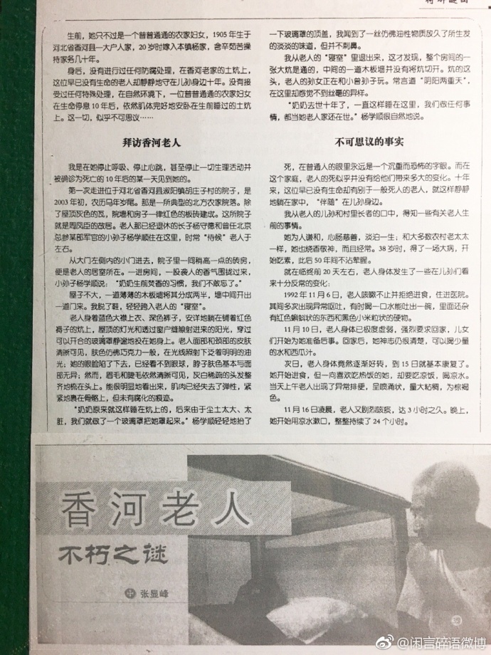 生前,她只不过是一个普普通通的农家妇女,1905年生于河北省香河县一大户人家,20岁时嫁入本镇杨家,含辛茹苦操持家务几十年。 身后,没有进行过任何防腐处理,在香河老家的土炕上,这位早已没有生命的老人却静静地守在儿孙身边十年。没有接受过任何特殊处理,在自然环境下,一位普普通通的农家妇女在生命停息10年后,依然肌体完好地安卧在生前睡过的土炕上。这一切,似乎不可思议……一下玻璃罩的顶盖,我闻到了一丝仿佛油性物质放久了所生发的淡淡的味道,但并不刺鼻。 我从老人的“寝室”里退出来,这才发现,整个房间的一张大炕是通的,中间的一道木板墙并没有将炕切开。炕的这头,老人的孙女正在和小曾孙子玩。常言道“阴阳两重天”,在这里却感觉不到丝毫的异样。 “奶奶去世十年了,一直这样睡在这里,我们做任何事情,都当她老人家还在世。”杨学顺很自然地说。拜访香河老人不可思议的事实 我是在她停止呼吸、停止心跳,甚至停止一切生理活动并被确诊为死亡的10年后的某一天见到她... (本文共3页) 阅读全文>>