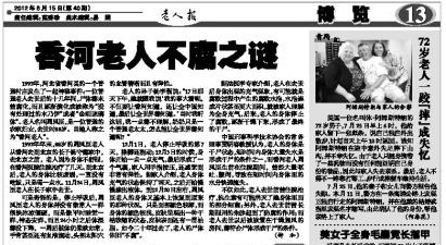 可是奇怪的是,停止呼吸后,周凤臣老人的身体并没有像常人一样很快冰凉僵硬,而是像平时睡觉一样,神态安详,而且24小时之后体温都没下降,一周后肢体仍柔软如常,手背甚至还有血液流动,头部太阳穴的血管清晰而且有弹性。