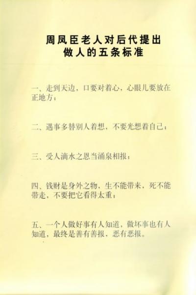 周凤臣老人作为一位普通的农家妇女,虽读不懂儒释道诸般学说大经大论,但她以一颗诚敬之心面对天地,以一颗慈悲之心面对人生,从而感悟到世间善恶因果的本质规律和人生的基本法则。她不仅自己持戒精严身体力行,还以各种方式教化后人。她的后辈儿孙只要提起老人,就想起她经常挂在口头的五句话。这是她总结出的做人的五条标准:第一,走到天边口要对著心,心眼儿要放在正地方;第二,遇事多替别人着想,不要光想着自己;第三,受人滴水之恩当涌泉相报;第四,钱财是身外之物,生不能带来,死不能带走,不要把它看得太重;第五,一个人做好事有人知道,做坏事也有人知道,最终是善有善报,恶有恶报。