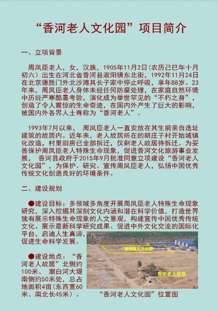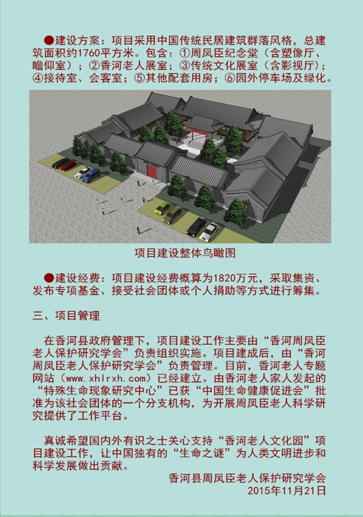 从2015年9月香河县新华街道、香河县三强建筑公司和周凤臣老人家人签订定了《建设“香河老人文化园”协议书》以来,周凤臣老人家人完成了“香河老人文化园”项目总体方案的设计工作(附件),并聘请国内权威建筑设计单位完成了“香河老人文化园”项目建筑方案的设计工作(图1)。