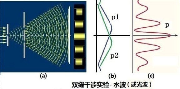 我先说一下干涉实验的概念(如上图)。如果有一个波,经过了两个狭缝,出来就变成两个子波了,这两个子波在随后传播过程中就会出现干涉。干涉的意思就是这两个子波在每个点都迭加,在有些点上两个波的运动方向相同,波的振幅就加强;在有些点上两个波的运动方向相反,振幅就减低,或者抵消为零。所以最后你观察到的波就是一些干涉条纹。如果看到干涉条纹,你就知道你观察到的是个波,而且这个波是在两个狭缝同时出现的,也就是既在A点又在B点,因为只有这样的情况,波才能出现干涉。