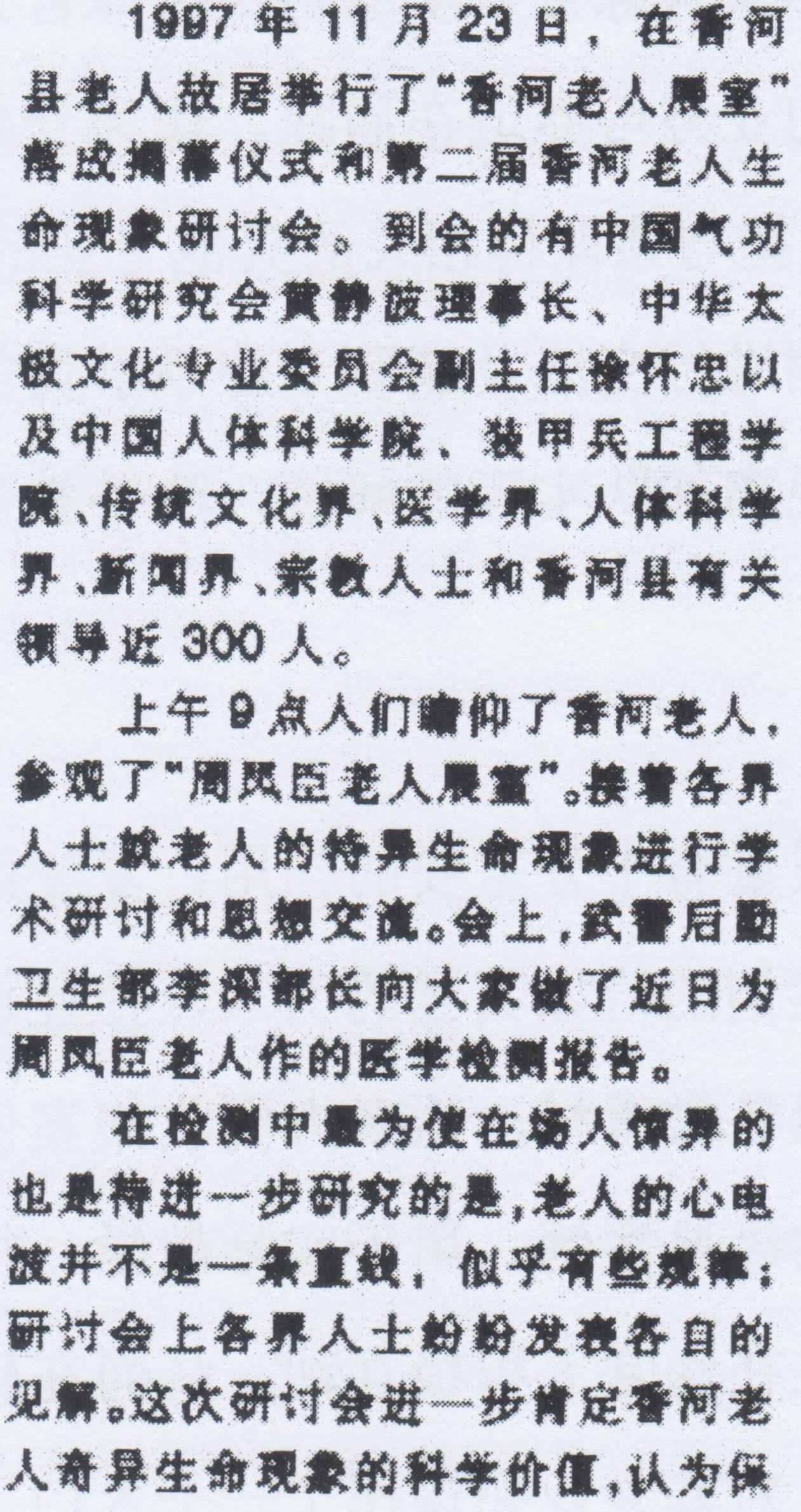 上午9点人们瞻仰了香河老人,参观了“香河老人展室”。接着各界人士就老人特异生命现象进行学术研讨和思想交流。会上,武警后勤部卫生部李深部长向大家做了近日为周凤臣老人作的医学检测报告。