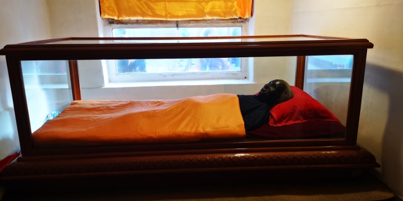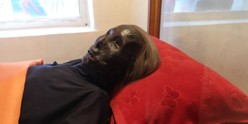 在老人逝世的二十几年时间里,刘尚林老师曾数次带领国内外不同层面的朋友瞻仰过老人,刘老师和考察团员们讲:可以看到老人遗容的三点变化:面部颜色由几年前的褐色变成了黑色;头发逐渐的在变黑;右眼睁开了一条缝。刘尚林老师的描述,得到了学强夫人的认可。