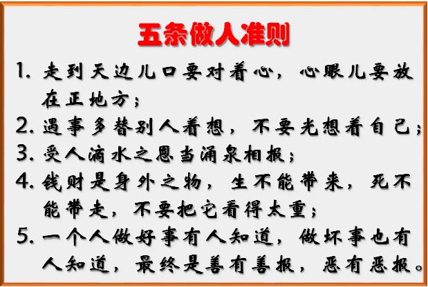 “走到天边,口要对着心,心眼儿要放在正地方”。老人其实说的是“真”,教导我们做人不能虚伪,要言行一致,要以真诚待人待物,无论遇到什么事情,无论何时何地,都要光明磊落,坦坦荡荡。心底无私,才能天地宽。