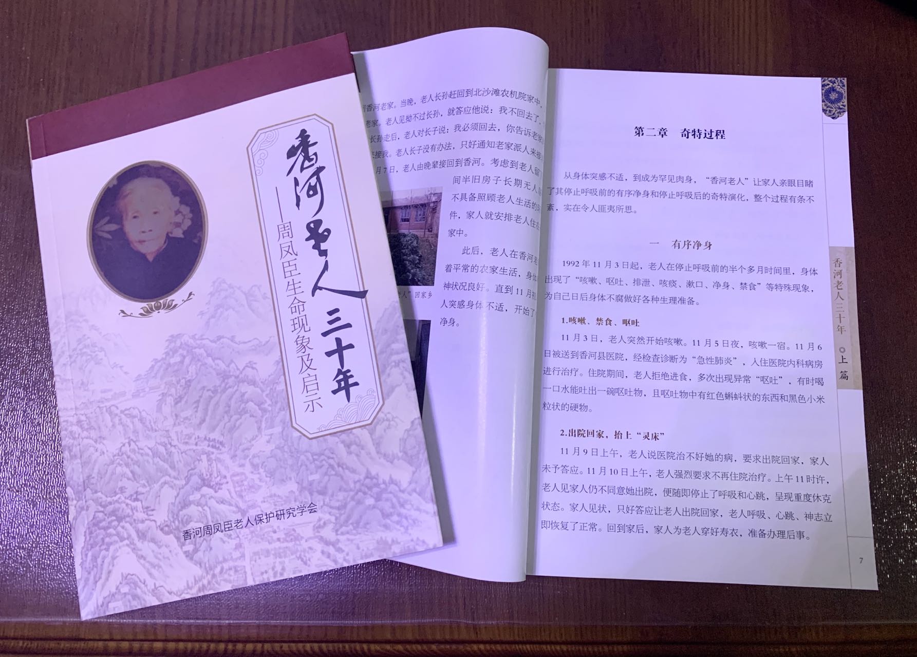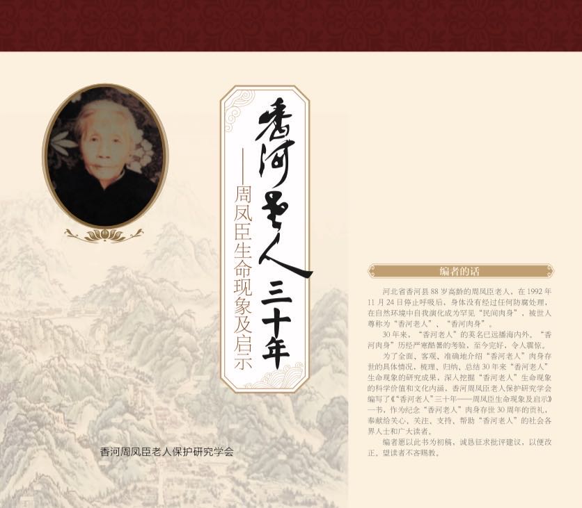 为了全面、客观、准确地介绍“香河老人”肉身存世的具体情况,梳理、归纳、总结30年来“香河老人”生命现象的研究成果,深入挖掘“香河老人”生命现象的科学价值和文化内涵,香河周凤臣老人保护研究学会编写了《“香河老人”三十年——周凤臣生命现象及启示》一书。