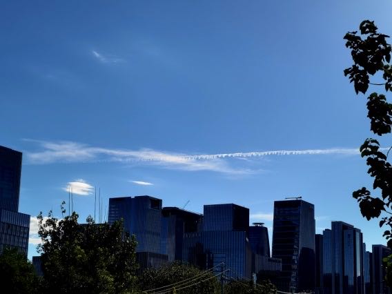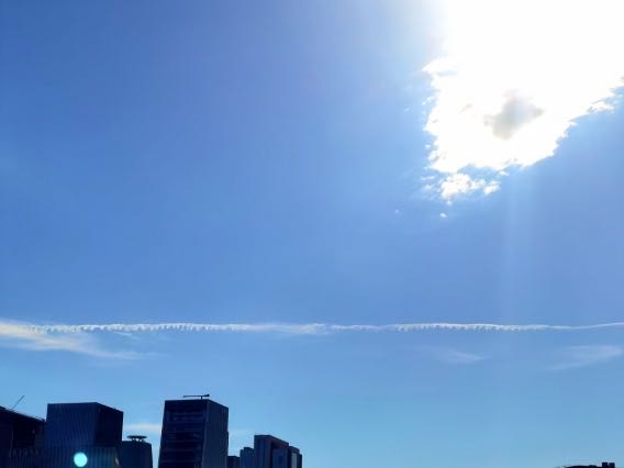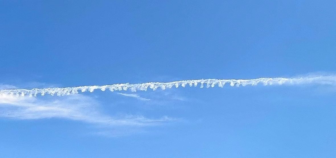 20230708上午07:31,在从自家去往女儿家的路上,拍到清澈的蓝天之上神奇的拉链状云彩(见下图),无法解释成因。
